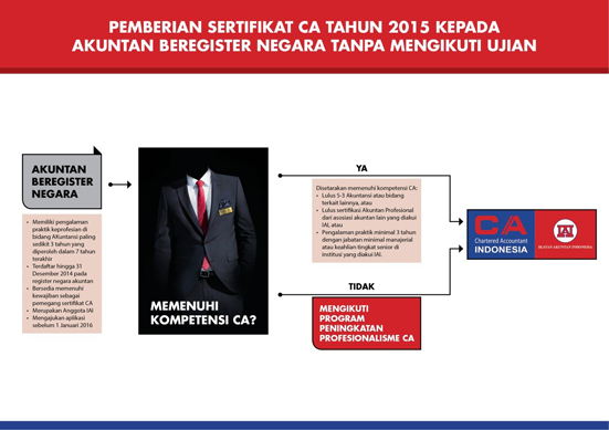 Bagi Akuntan Beregister Negara yang memenuhi salah satu atau lebih persyaratan di atas, dapat mengajukan permohonan sertifikat CA tanpa melalui ujian sebelum 1 Januari 2016. Sementara yang belum memenuhi kompetensi CA, harus mengikuti program Peningkatan Profesionalisme CA yang diselenggarakan IAI.