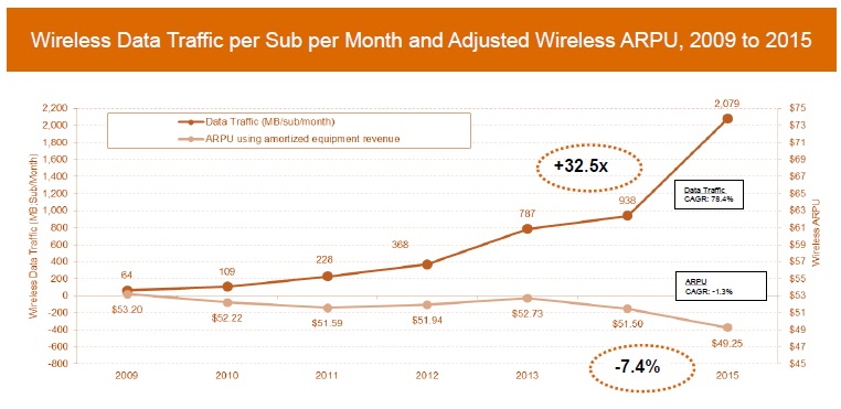 Jika melihat dari sisi ARPU (average revenue per user), lagi-lagi telco mengalami tekanan luar biasa. Meski data menunjukkan traffic telco terus mengalami pertumbuhan dari tahun ke tahun, namun ARPU cenderung menurun (sumber: CTIA, MoffetNathanson estimates & analysis). Dari sisi indikator ekonomi memang hal ini adalah sinyal yang baik bagi perekonomian karena mampu menekan angka inflasi. Namun bagi stakeholder telco tentu hal ini sangat merisaukan.