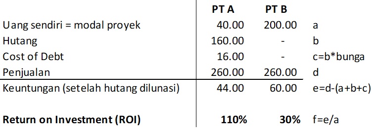 Jika dilihat dari perhitungan di atas, tampak jelas bahwa PT A yang mendanai proyek dengan hutang akan memperoleh keuntungan yang jauh lebih besar dibanding PT B yang menggunakan dana sendiri.