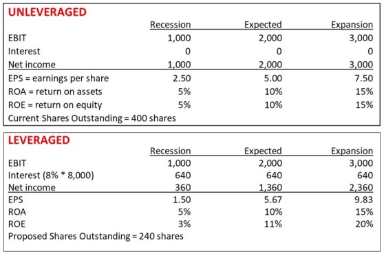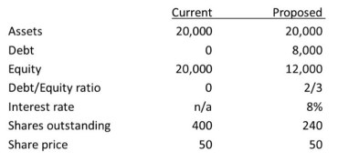 Saya akan memperjelas dengan sebuah ilustrasi berikut. PT D yang belum melakukan leverage sedang mempertimbangkan menambah pinjaman dalam struktur pendanaannya. Skenarionya adalah dengan berhutang sebesar 8.000 dan membeli kembali 160 lembar saham pada harga 50 per lembarnya.